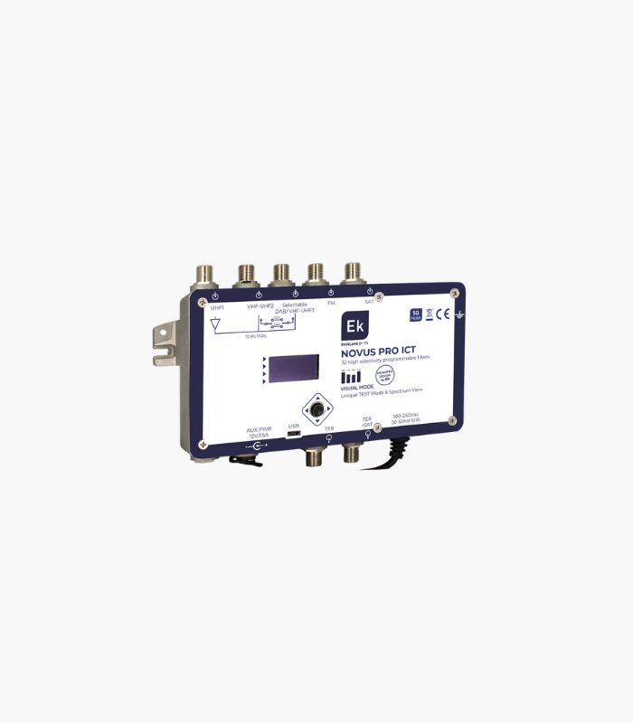 Amplificador 32 filtros UHF ultraselectivos. 1 entrada UHF (G>60dB)/ 1 entrada UHF con previo interno (G>70dB)/ 1 entrada UHF (G>60dB) configurable para DAB/1 entrada FM (G>28dB)/ 1 entrada SAT (G>35dB). Alimentación previos (12V/24V).Nivel de salida: TER 120dBμV (DIN 45004B)/ SAT 119dBμV (IMD-35dB). Programacion automática y ajuste de filtros individual mediante Visual Mode (Patent pending) Detección de defectos en instalación mediante Modo Test. Fuente redundante (opcional).