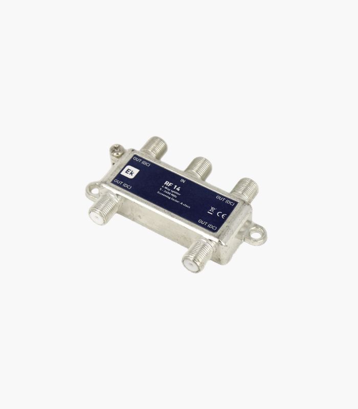Repartidor clase A de 4 salidas. Banda de paso: 5-2400 MHz. Pérdidas de paso: 8,1dB (862 MHz) / 10dB (2300 MHz). Con paso de corriente DC.