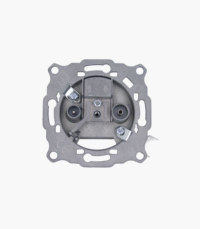 Base de toma intermedia con garras y dos conectores IEC universales RD-TV-SAT. Frecuencia 5-2400 MHz. Atenuación de derivación: 10dB (TV-RD) / 12dB (SAT). Pérdidas de paso: <2,9dB (TV-RD) / <3,2dB (SAT). Fijación del cable mediante tornillo sobre plástico.